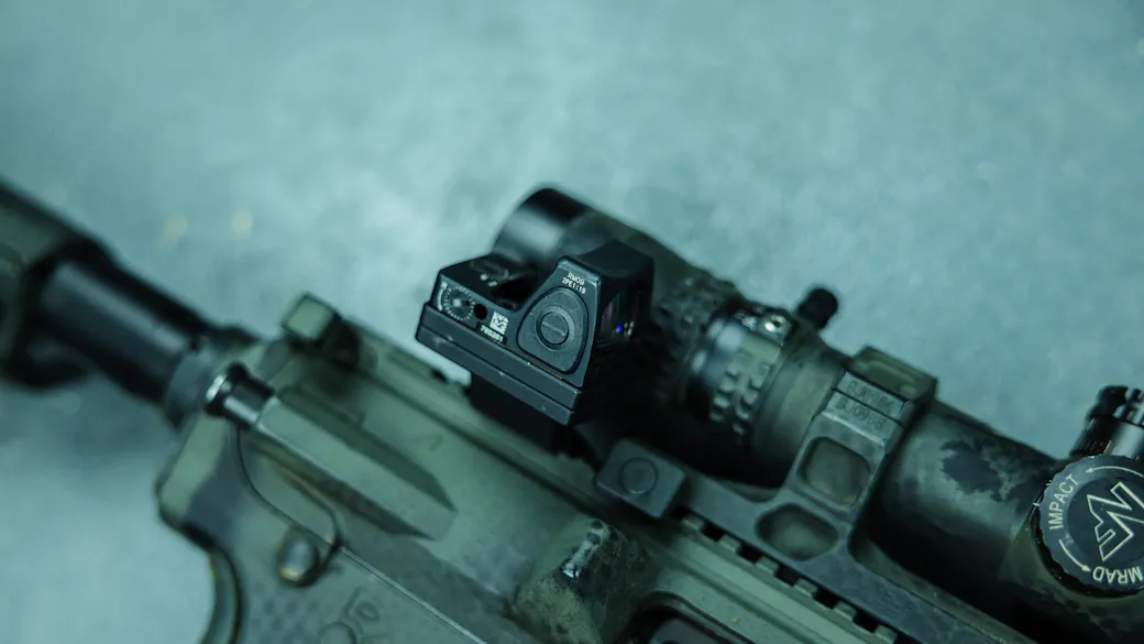 In conjunction with our Nightforce scope, we opted for a Trijicon RM09 on one of our T.REX Offset mounts. With the minimum magnification on our primary optic being 2.5x, we wanted an unmagnified solution for closer targets. As we mentioned earlier, this setup is easier to use and weighs less than most offset iron sight sets. Sure, irons don't need batteries, but with proper maintenance and care, you can easily avoid a dead optic battery altogether.