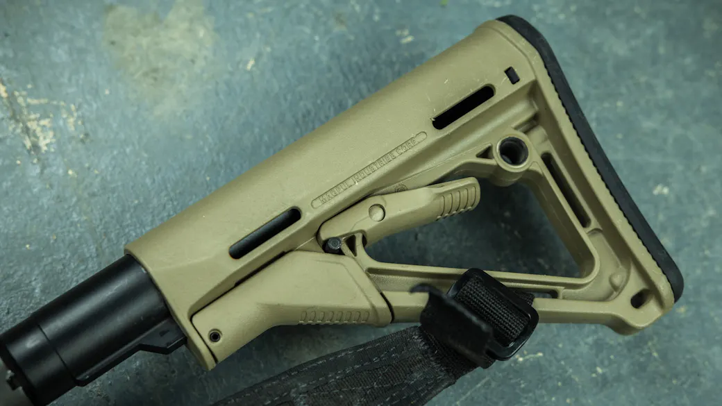 The complete lower we purchased came with a Magpul PRS Lite fixed stock, but we decided to swap over to a Magpul CTR for this particular loadout. This allows us to change our length of pull and provides a better platform for upright shooting than the bulkier PRS stock.