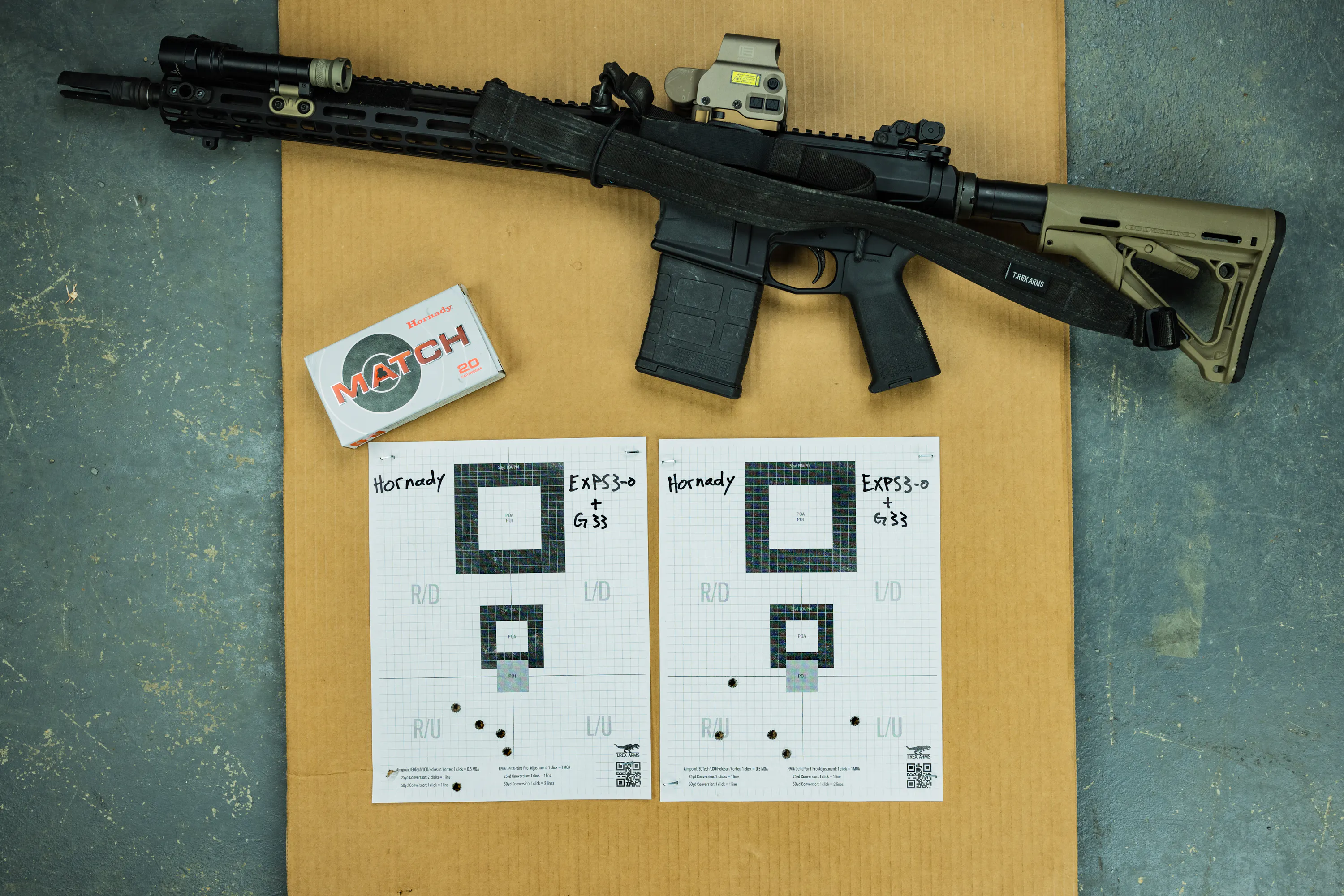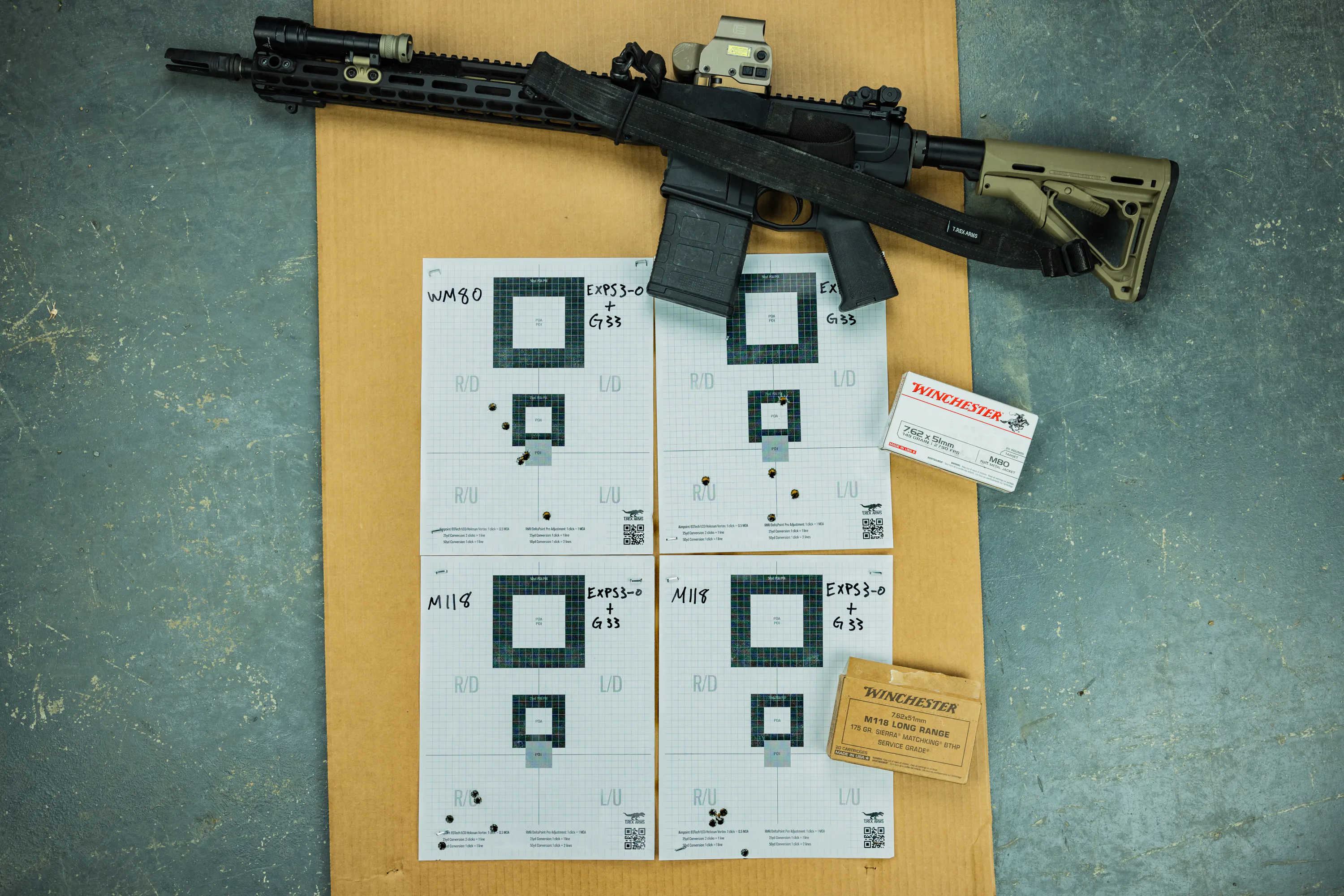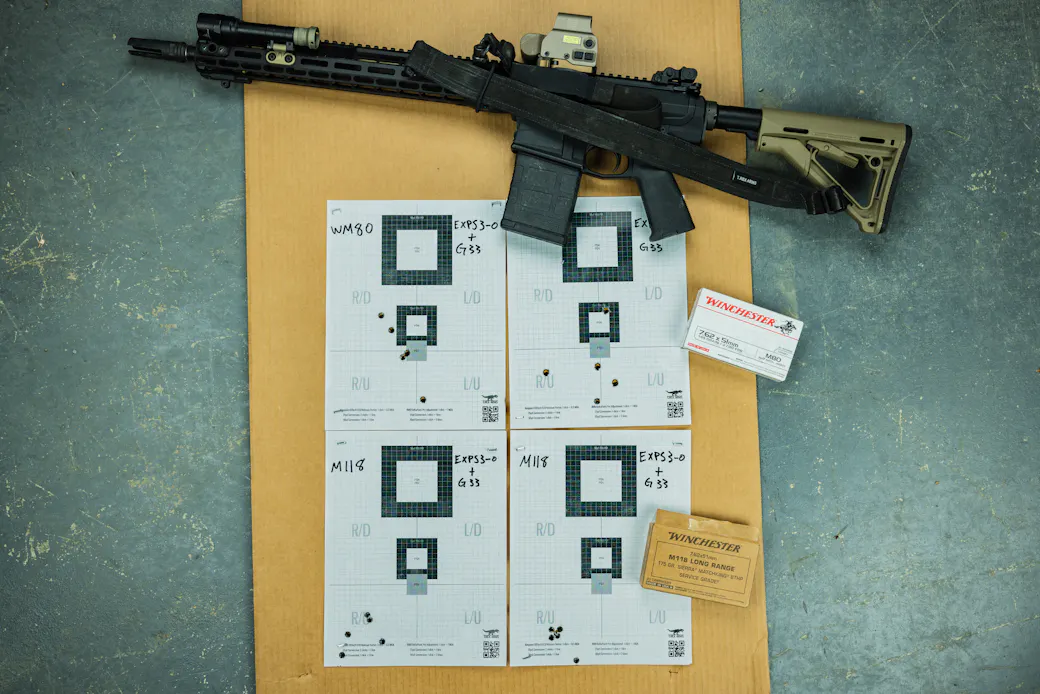Once we got to the range, we zeroed the rifle and used a LeadSled to stabilize the rifle and remove as much human error as possible to get a rough idea of our groups and what ammo the barrel did and didn't like. The EOTECH/Magnifier combo has some limitations when it comes to getting precise groups. Still, it was apparent Winchester M118LR was more consistent than the standard M80 ball we will use throughout most of this test.