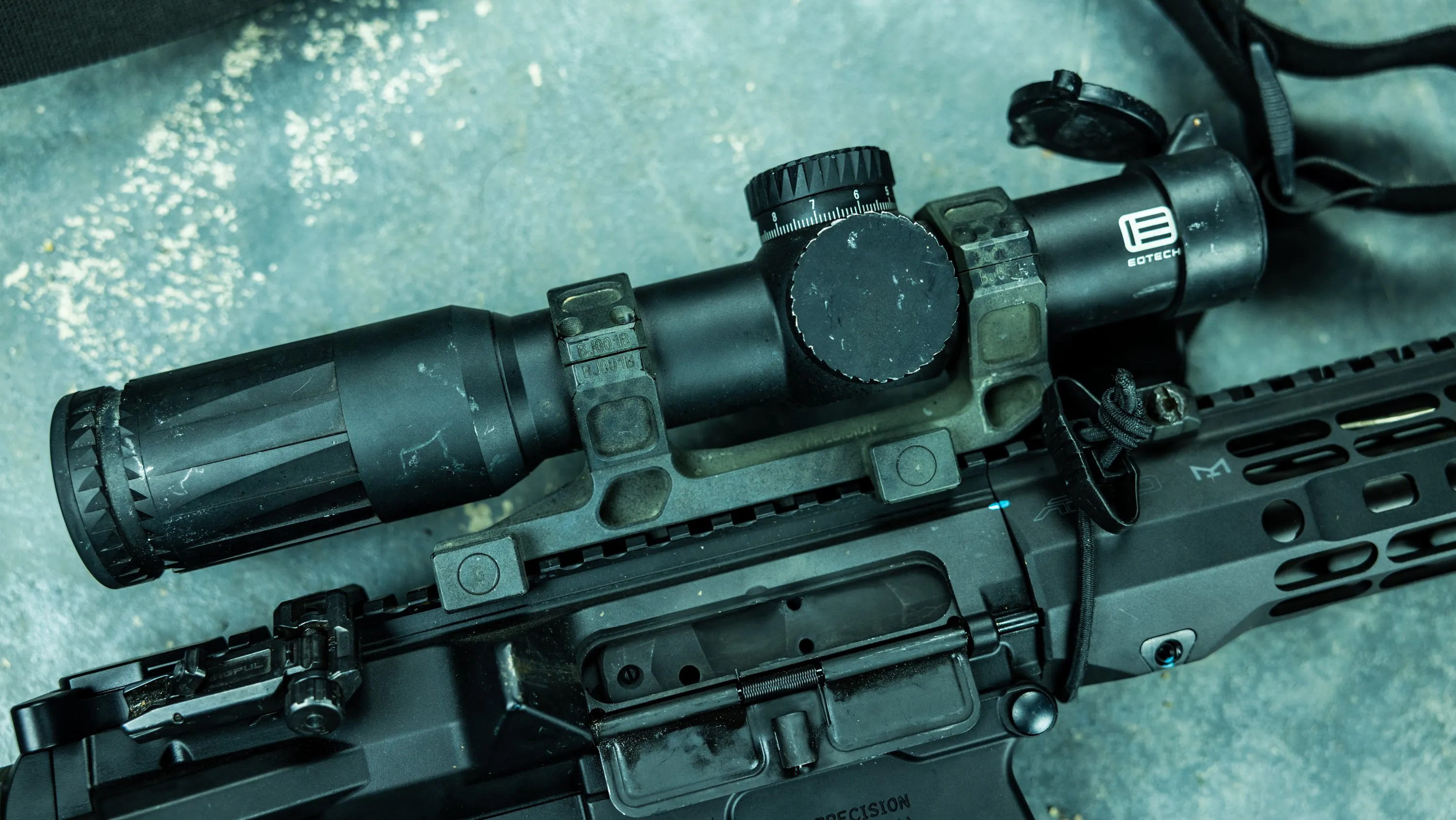 We added some more magnification for our second loadout and made minor changes. While the EXPS 3-0 is one of our favorites, magnified optics are ideal for large-frame rifles. We chose the EOTECH Vudu 1-10 in a Geissele 34mm scope mount. This optic setup performed well on our SCAR 17, so we figured we'd give it a shot on this rifle.