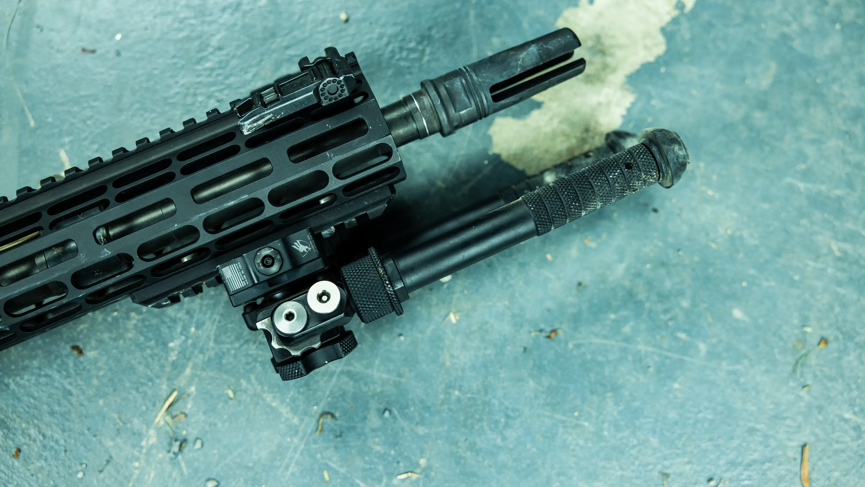 We swapped out the Harris bipod in favor of an Atlas bipod. This bipod is sturdier than the Harris and allows the legs to sit at both 90-degree and 45-degree positions. This Atlas bipod came with an ADM QD mount, so all we needed to add was a Picatinny section to the bottom of our M-LOK handguard. This method is slightly bulkier but is a more solid option that is quick to attach. Using a longer Picatinny section also allows us to push the bipod forward or backward, allowing for more adjustability.