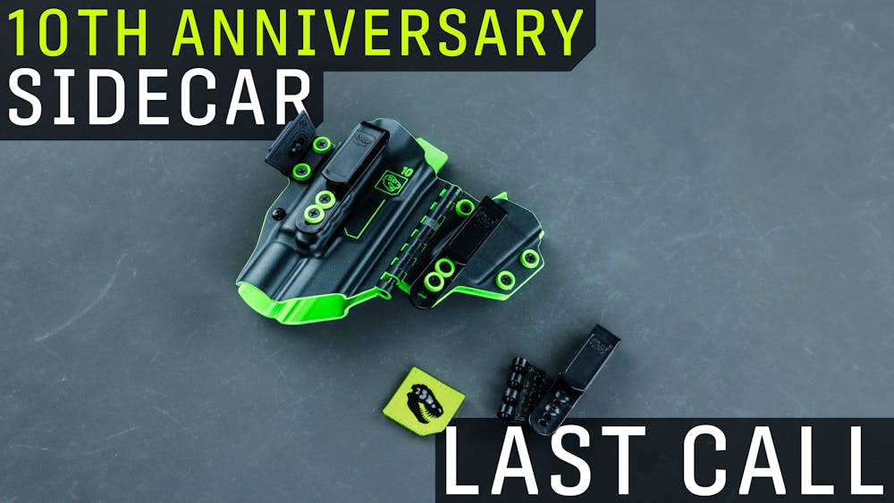 This is the final week you'll be able to pick up a commemorative 10th Anniversary T.REX Sidecar Holster. It comes in a classic black and green color combo that has been on our website since the beginning, with a special small green T.REX patch, and a new adjustable Raptor claw (a preview of something that will be coming to future holsters). Aside from those things, it is no different than the Sidecar 2.0 that you can buy on our website any day—the culmination of ten years of holster-making experience and manufacturing upgrades. We greatly appreciate your part in this first decade of company growth. Thank you for supporting us and the ways that you have allowed us to grow as holster makers and as a company.