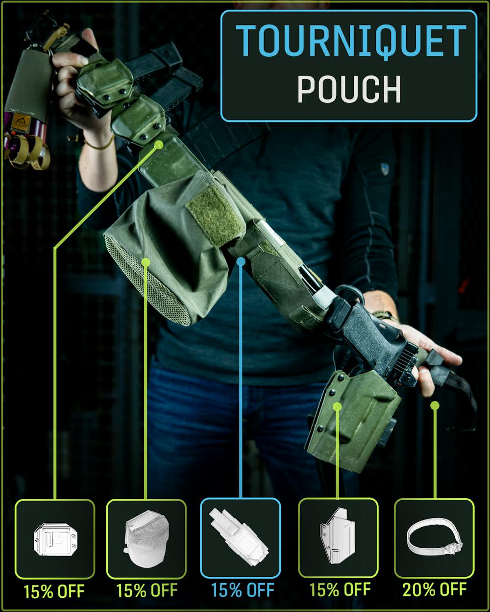 Whether you’re at the range, hiking in the woods, or just driving to work, having a tourniquet handy is a must. Our T.REX Tourniquet Pouch Kit is a ready-to-go solution for just that and great for mounting alongside many other items on our Speed Belt. The items called out above are 15-20% off from now through Monday!