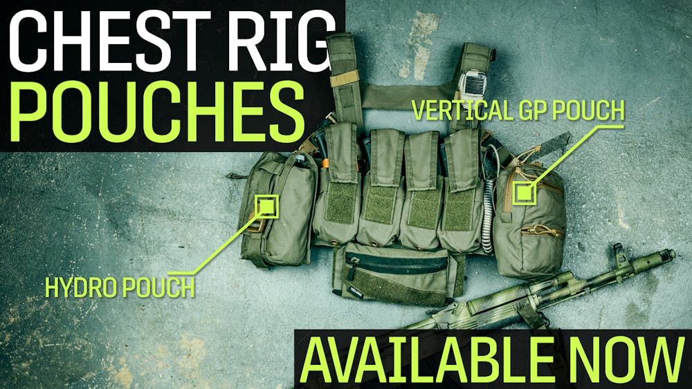 To go along with the Quad Flap Chest Rig, we have a new suite of pouches that compliment the purpose of our new rig. This lineup includes our Vertical GP Pouch, our Hydro Pouch, and a new closed-flap Tourniquet pouch. We designed all of these specifically to work well with the Quad Flap Chest Rig, but they will work with other gear as well.