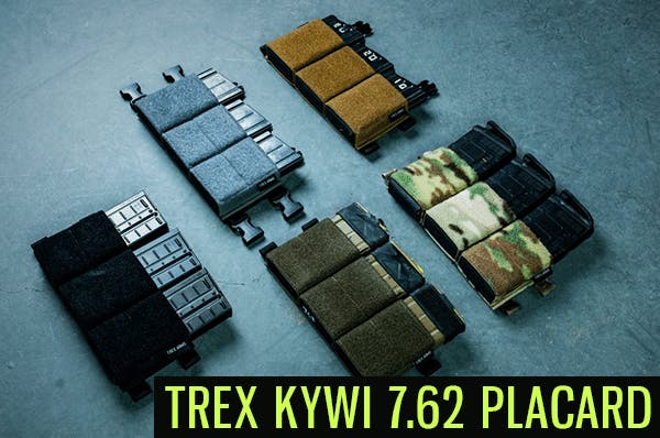The long-awaited 7.62 version of the T.REX Esstac KYWI Placard is now available. These attach via hook/loop and buckles to plate carriers and chest rigs and hold three SR-25/AR10 style magazines.