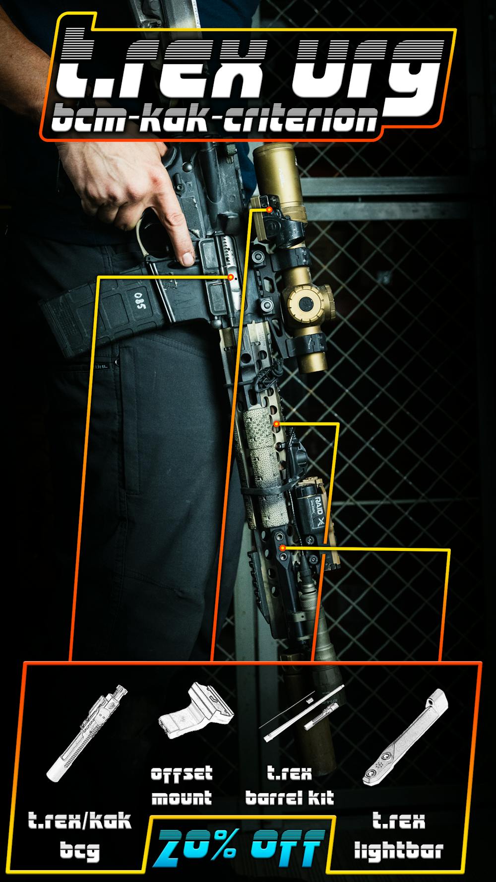 IMPORTANT: To access the sale, you MUST follow the links or click the images provided in this newsletter to see the sale prices and receive the discounts. The Ready Rig is a covert chest rig that allows you to carry magazines, tools, medical supplies, and other essential equipment while maintaining a low profile. Currently, the Ready Rig and all other T.REX nylon products are 20% off, letting you kit up without breaking the bank. Build your own rifle and don’t spend a small fortune on parts while you do it. Save 20% on all T.REX branded rifle parts, like our T.REX BCG, Barrel Kit, and Lower Parts Kit, as well as light and optic mounts. |