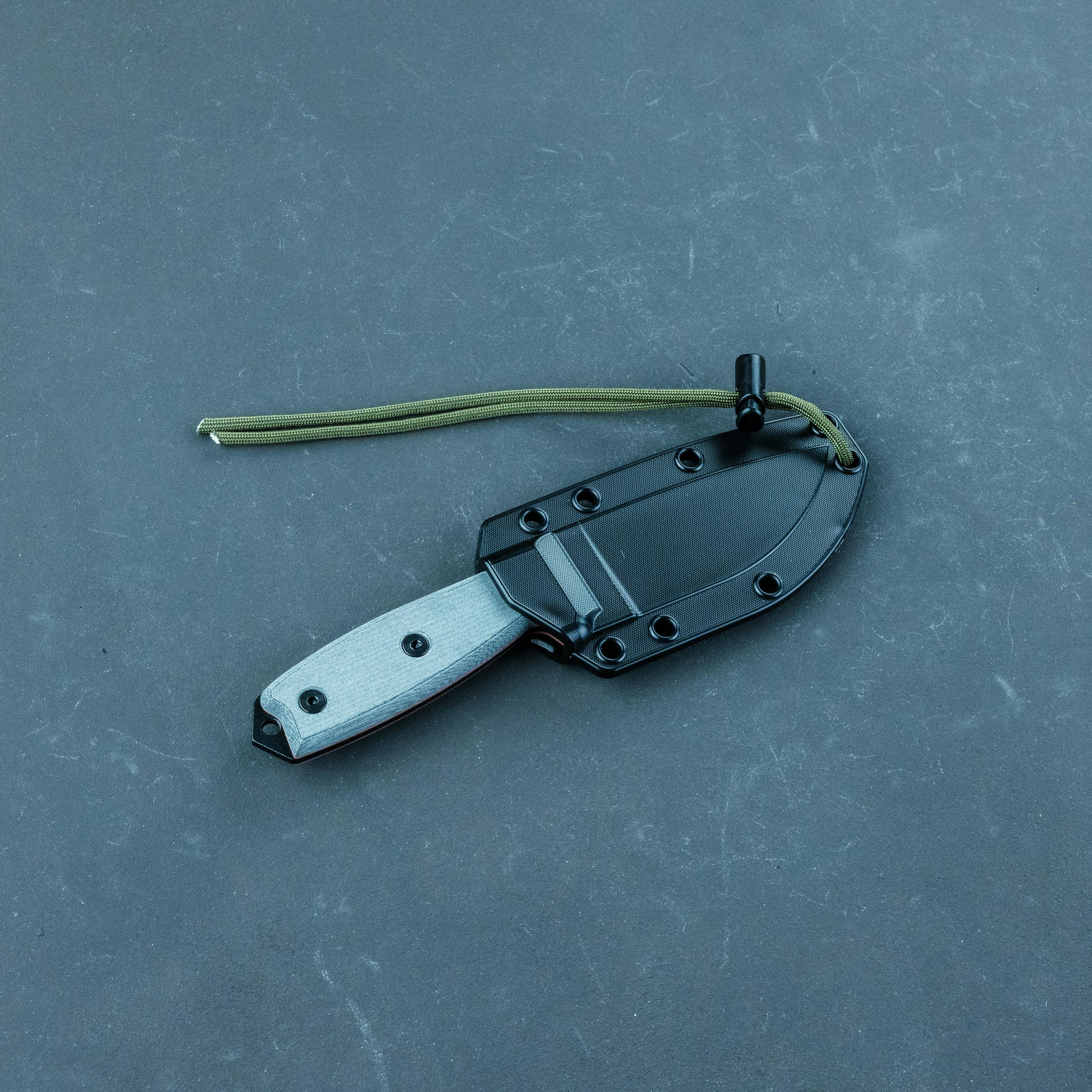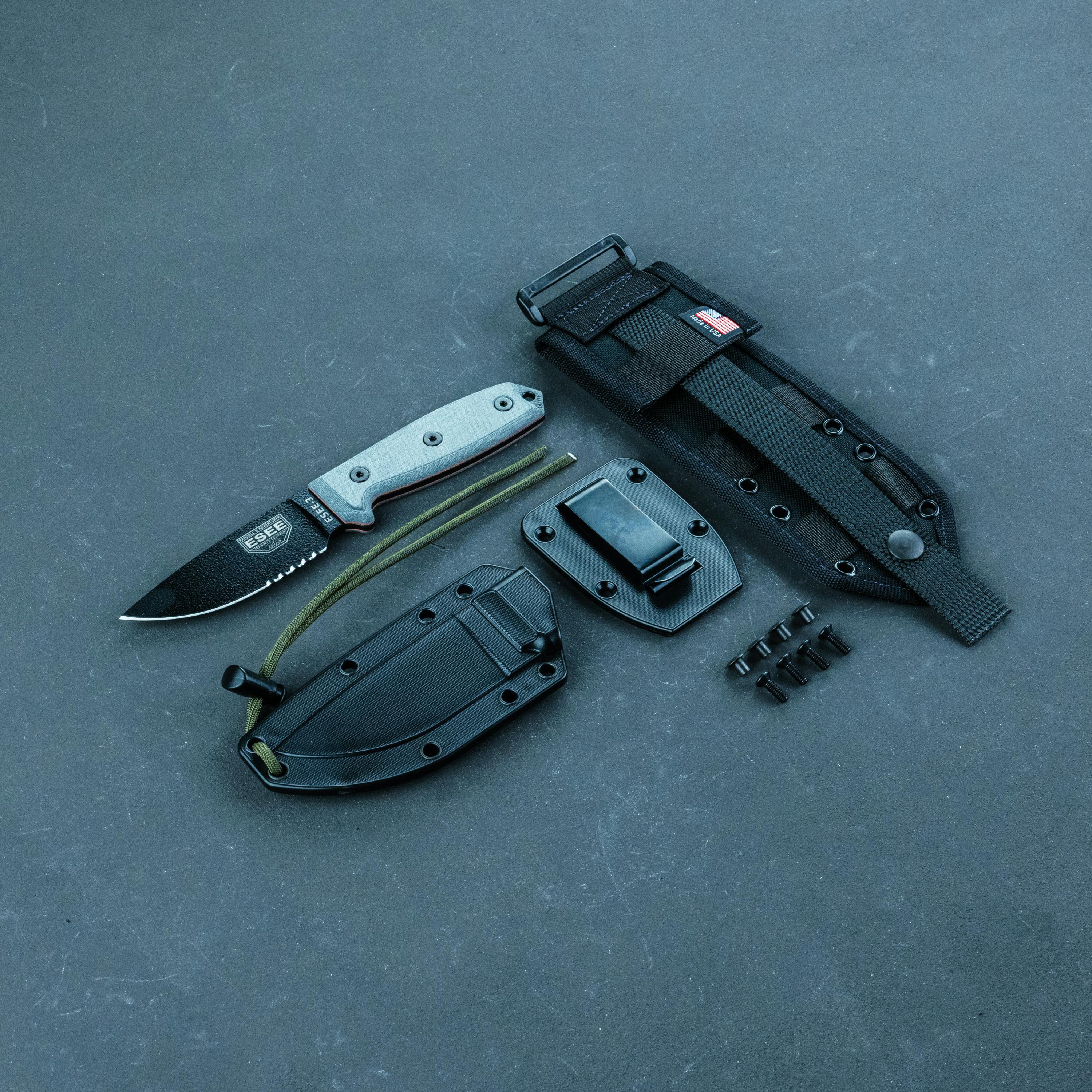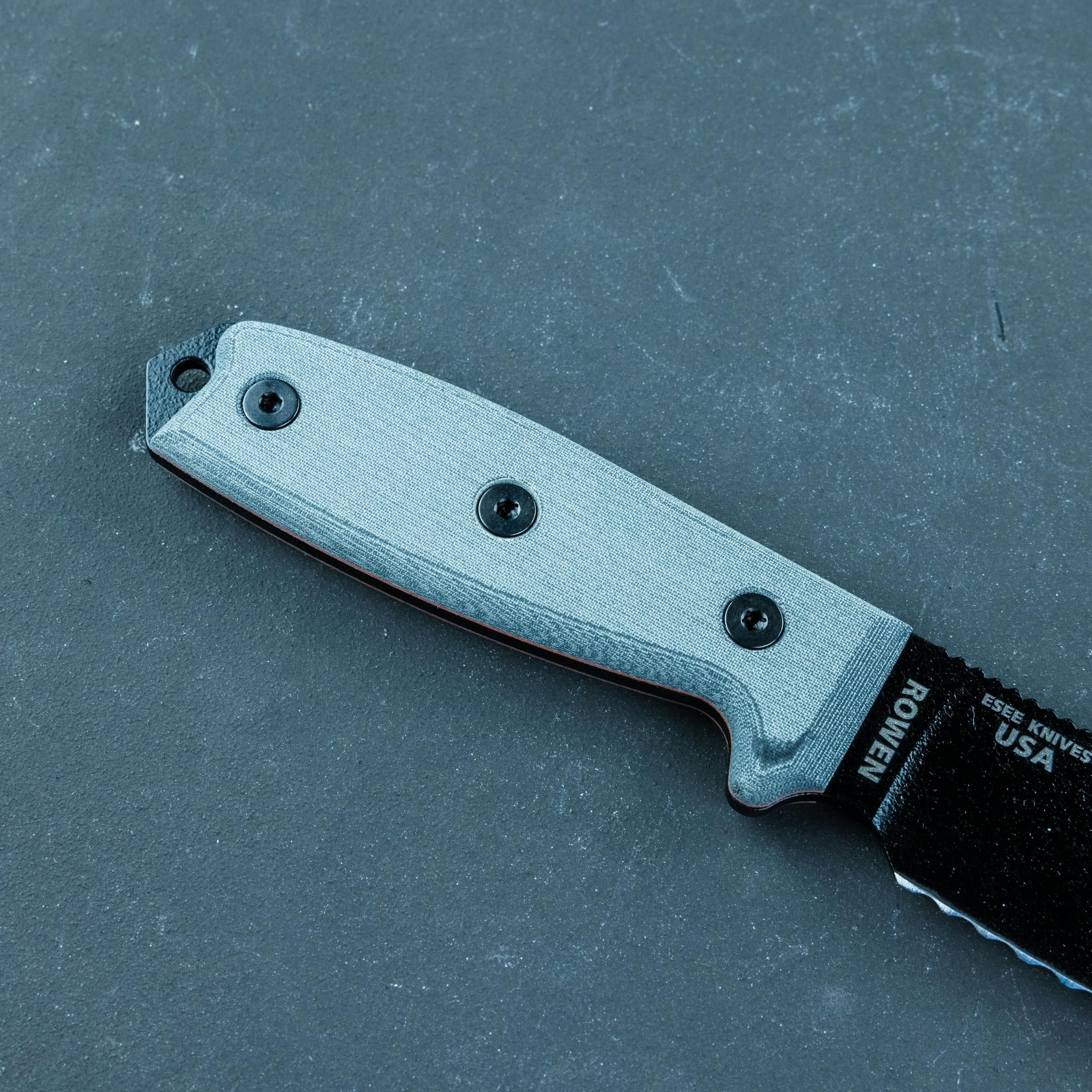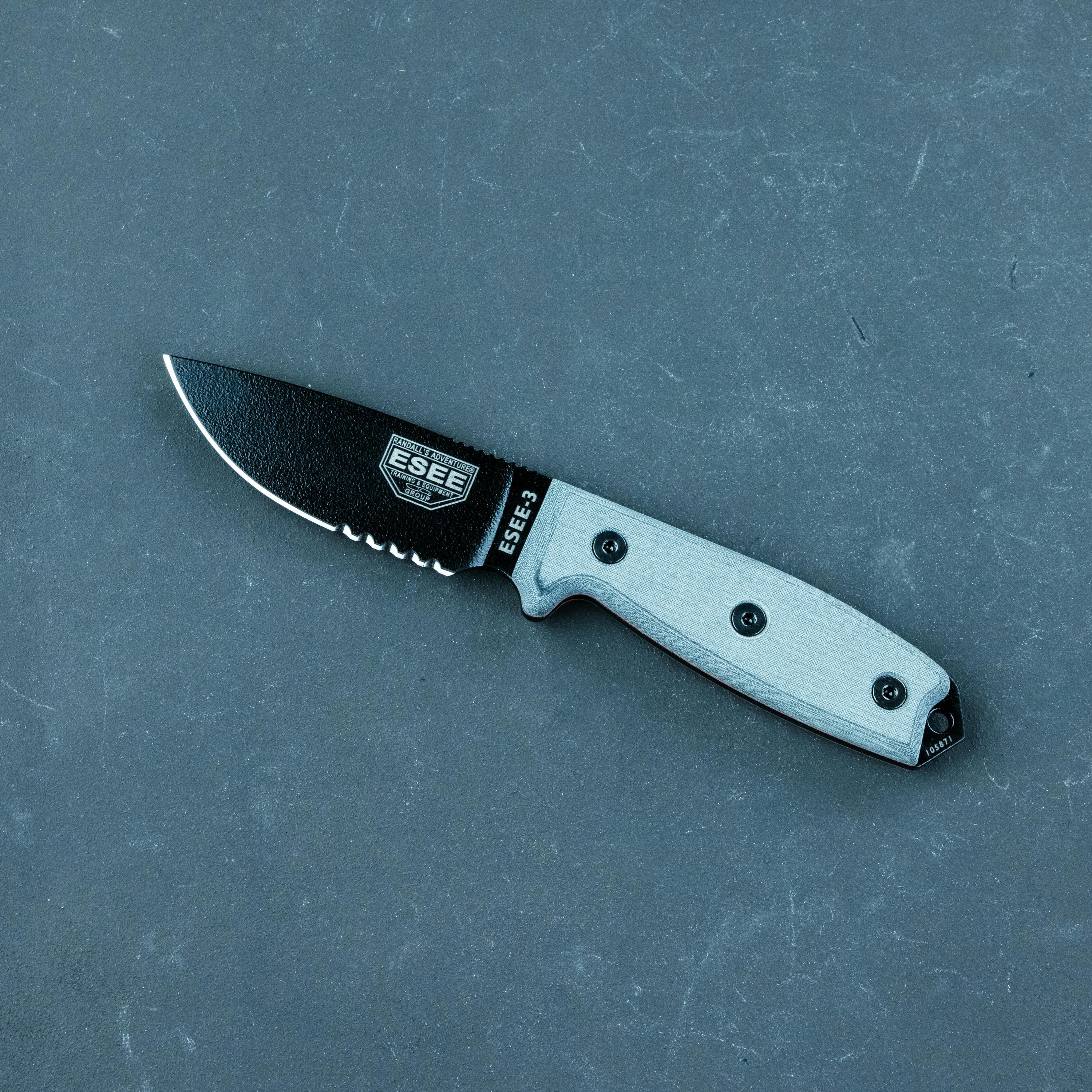 The ESSE-3 is a mid-size fixed-blade knife that lends itself well to a variety of uses. This model features a 1095 high-carbon steel blade with an emphasis on durability. 1095 is an excellent choice for overall toughness, edge retention, and ease of sharpening. However, it doesn’t have the corrosion-resistant properties of comparable stainless steels, so more upkeep is needed. This model has a grey Micarta handle and a partially serrated edge for more cutting power.