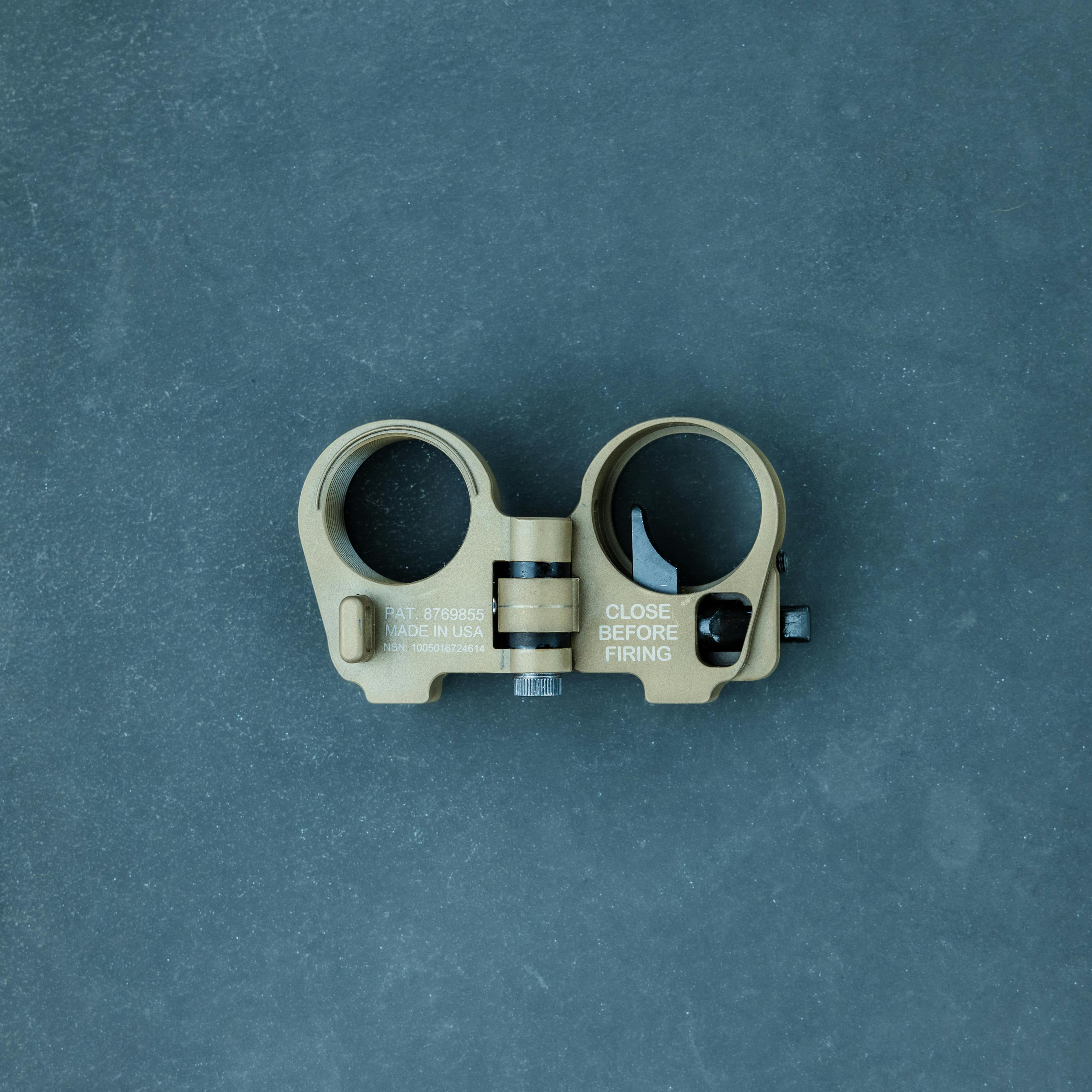 Simple one-button release folds the stock. To engage, just unfold and fire. The stock automatically locks into place once unfolded. The adapter does not affect gun function when unfolded in the standard fire position; the rear portion of the adapter is built to the same specifications as a standard receiver to ensure maximum compatibility. An integrated QD attachment point is included.