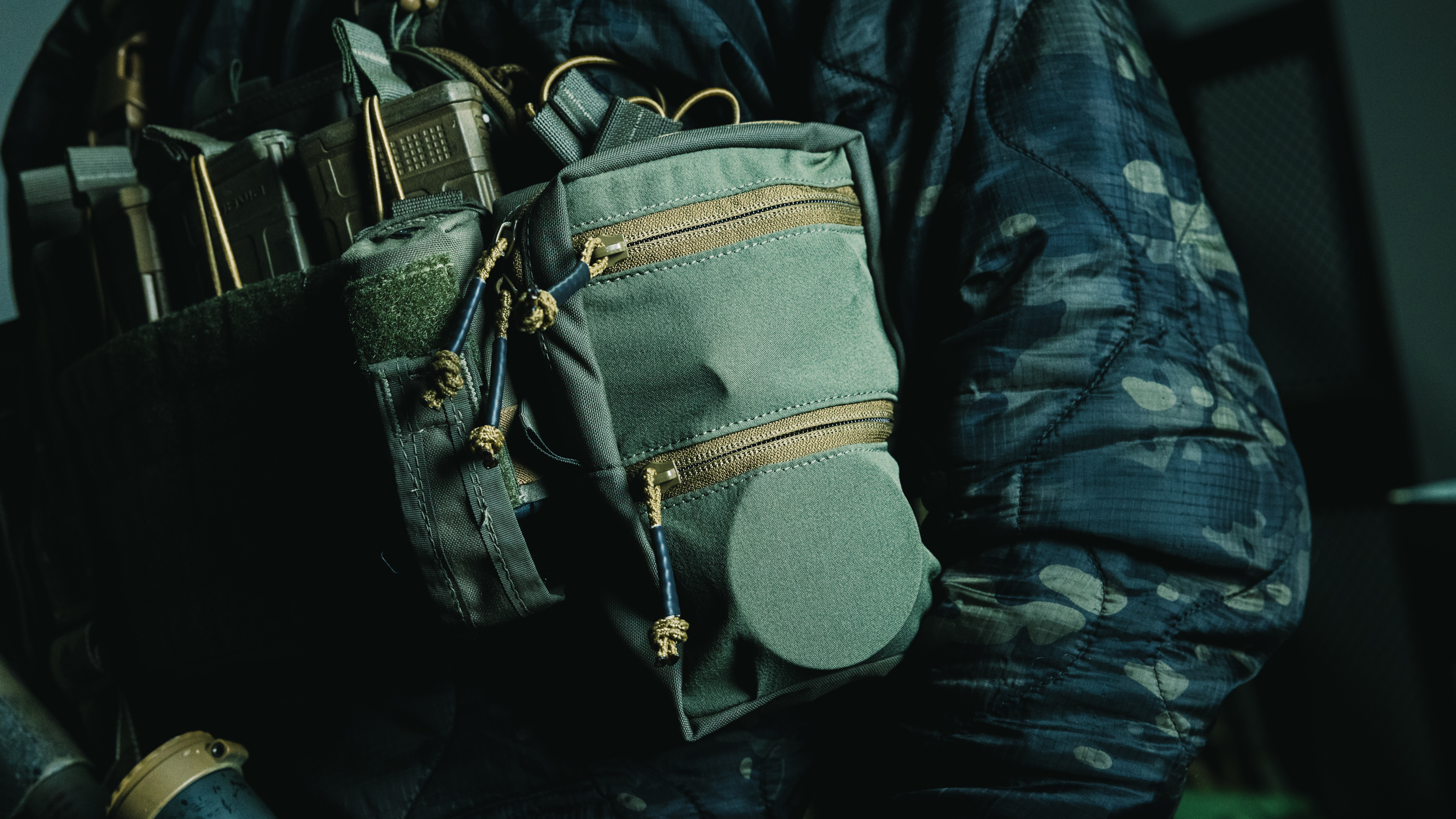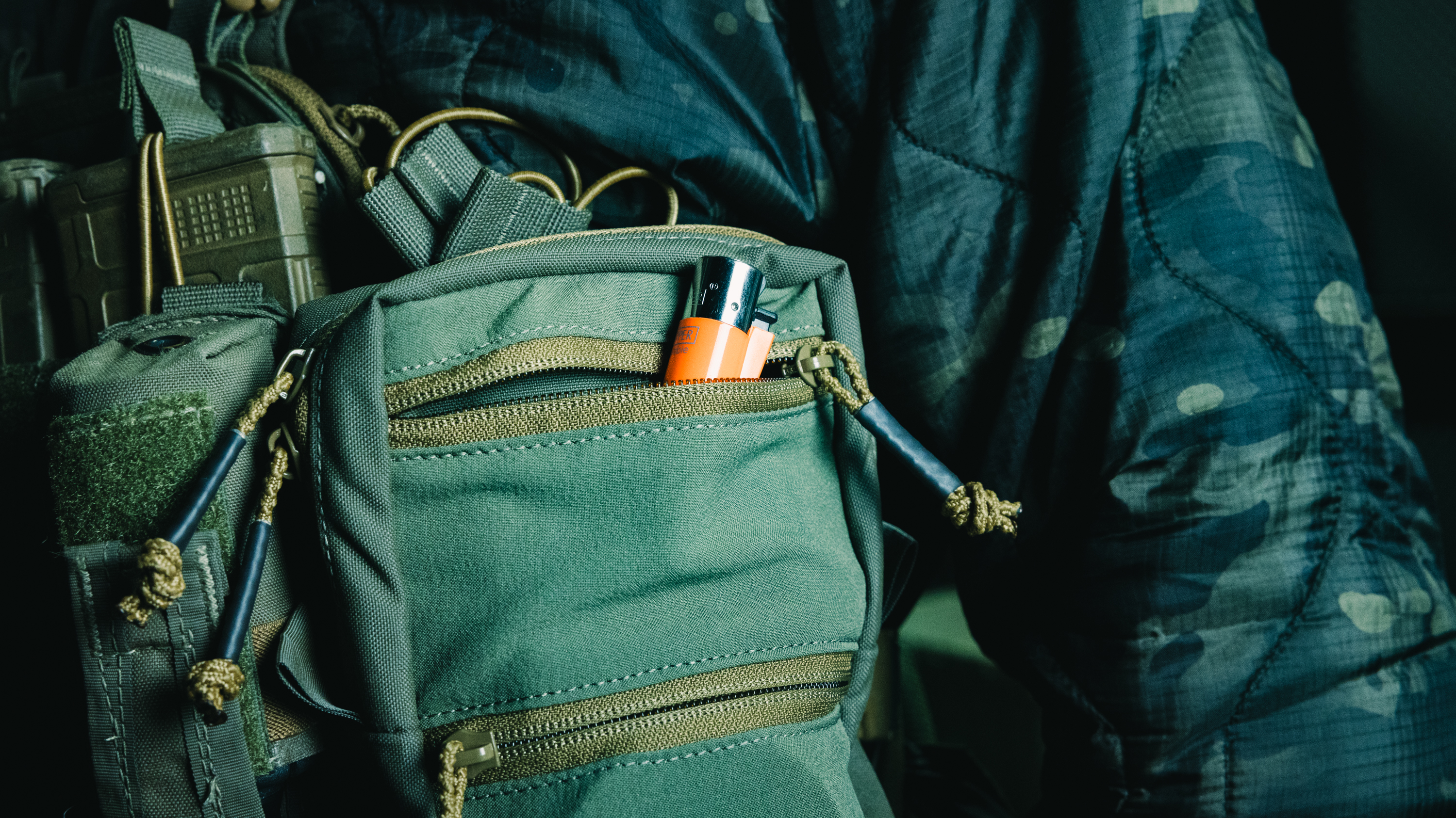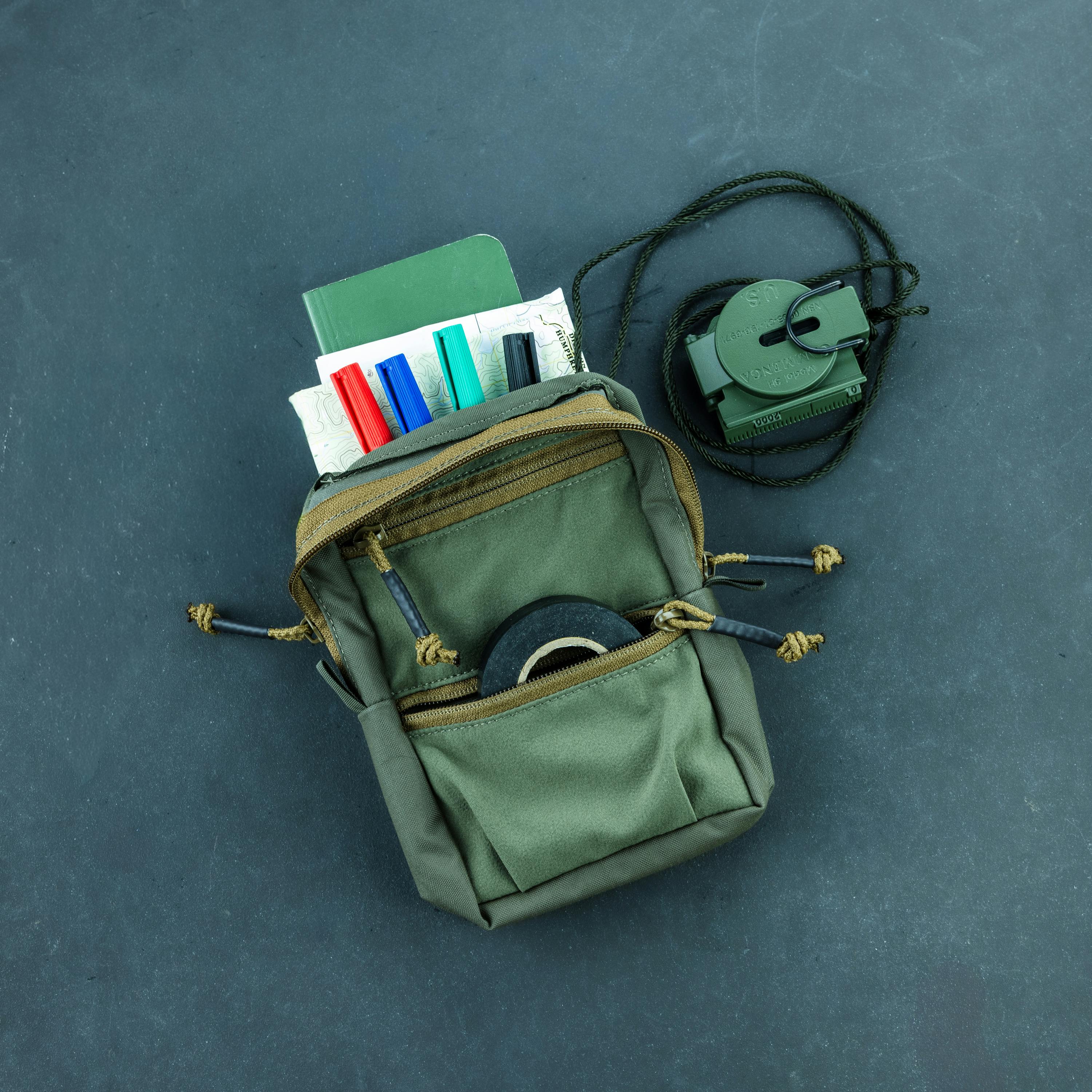 - The main pocket features a Velcro loop field for organization and four internal tie-downs to keep important or valuable items attached to the pouch.