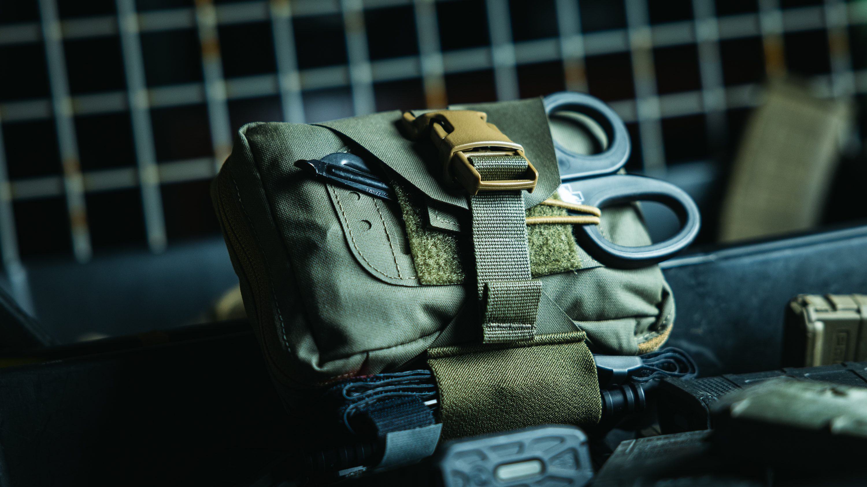 - Integrated ambidextrous trauma shear sheath with shock cord pull tab.