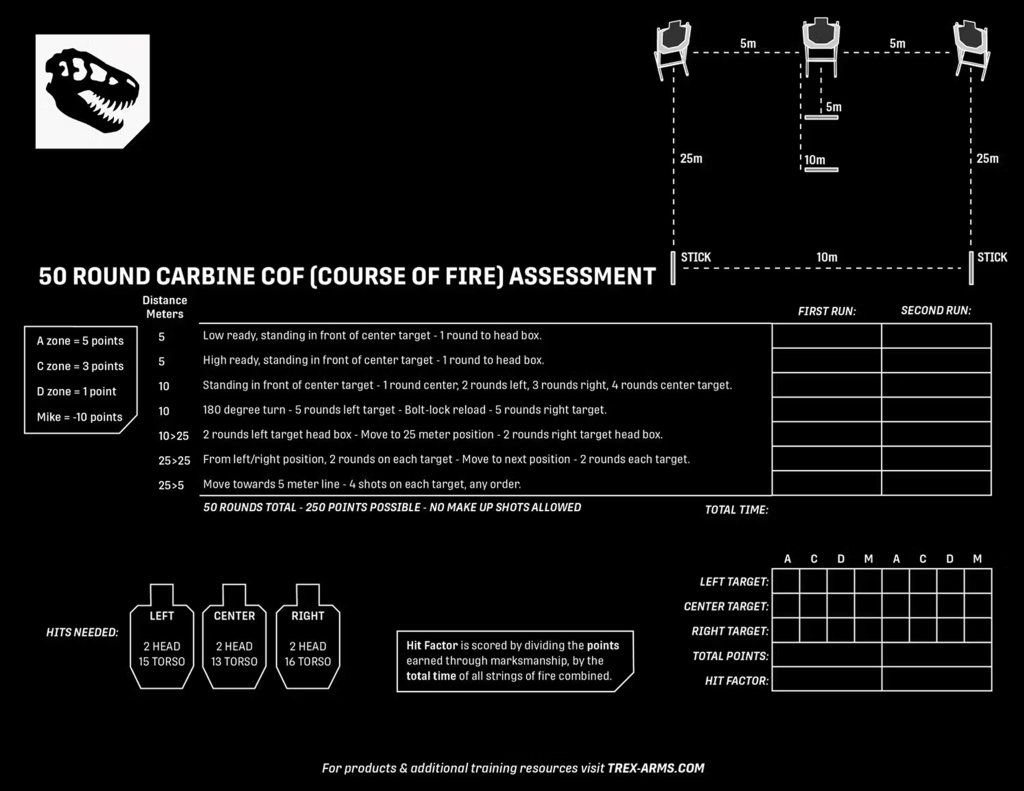 Our 50 Round Carbine Course of Fire combines fundamental skills with more advanced movements and transitions while promoting a balance of speed and accuracy through hit-factor scoring. You will need 50 rounds of rifle ammunition, 3 USPSA-style targets, and 25 meters of usable space for this course.