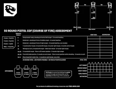 The 50 Round Pistol Course of Fire emphasizes a balance of speed and marksmanship, utilizing hit-factor scoring, while reinforcing both fundamental and advanced skills, such as movement and target transitions. You will need 50 rounds of ammunition, 3 USPSA-style targets, and 20 meters of usable space.