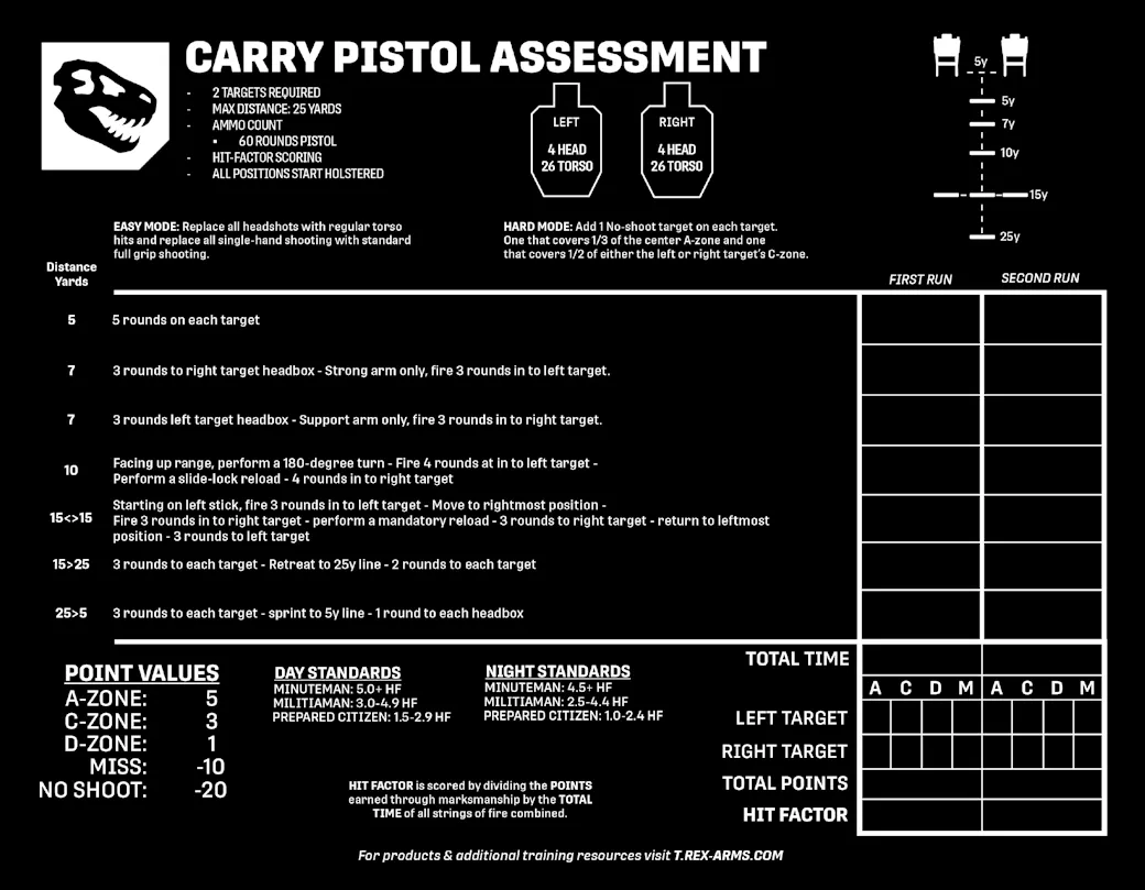The Carry Pistol Assessment is for anyone who carries a pistol as their primary weapon, whether you are a law enforcement officer with an outside-the-waistband setup or the prepared citizen running concealed with a pistol from the appendix position. This assessment gives you a practical baseline of your current capabilities and highlights areas for improvement as you choose to carry a pistol to defend life.